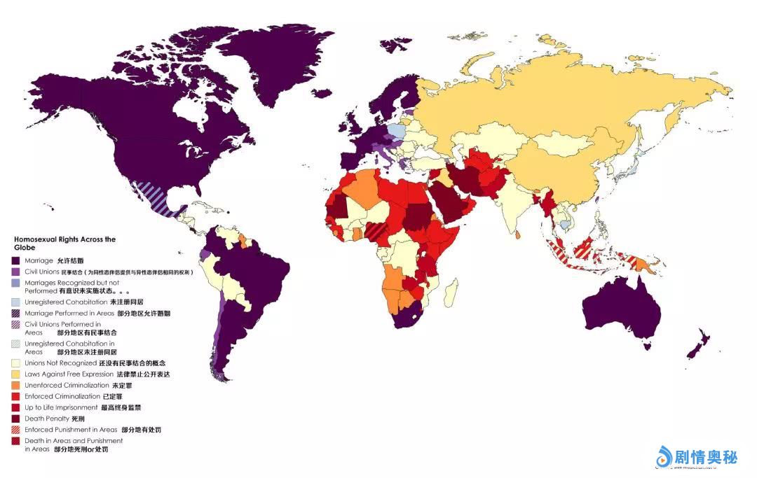 蓝紫色部分代表允许结婚或同居;黄色部分代表同性恋未被定义或未定罪,也就是说,同性恋还是灰色地带;