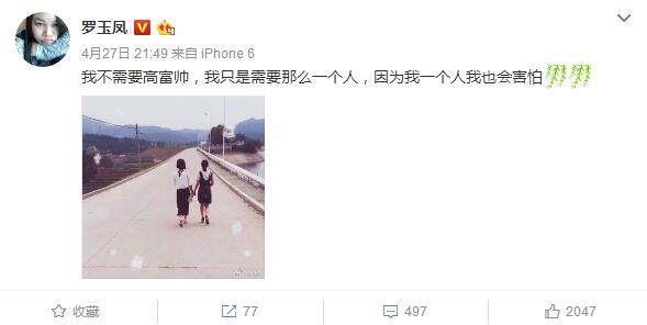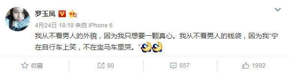 罗玉凤在微博中多次透露过,希望能找到自己的白马王子,很多文字都显示出,她渴望谈一场恋爱,然后结婚生子,过平凡幸福的生活。曾经一度,罗玉凤还说自己傍上了一个美国的高富帅男子,不过估计那又是她的杜撰。