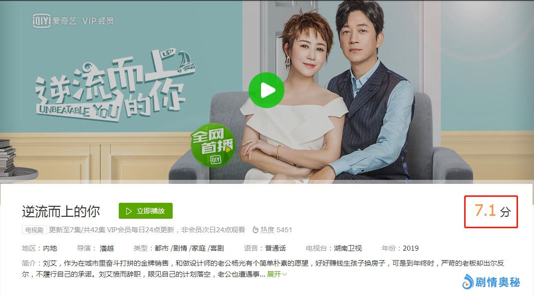 原本两位实力派演员首次联手,基本上是可以令电视剧《逆流而上的你》未播先火,赚足期待的。然而,期望越大失望越大,该剧从2月12日登陆大荧幕后,虽然收视率一度高歌猛进,但是伴随着剧情的发展,剧情漏洞频繁显现后,该剧的口碑也一度遭遇了滑铁卢。虽然豆瓣评分尚未出炉,但是爱奇艺也仅给出了7.1分的中等分数,而虽然收视率和网播量一度高涨,最大的原因或许应该是《知否》的完结,以及众多网友和观众是冲着潘粤明而慕名而去收看的。