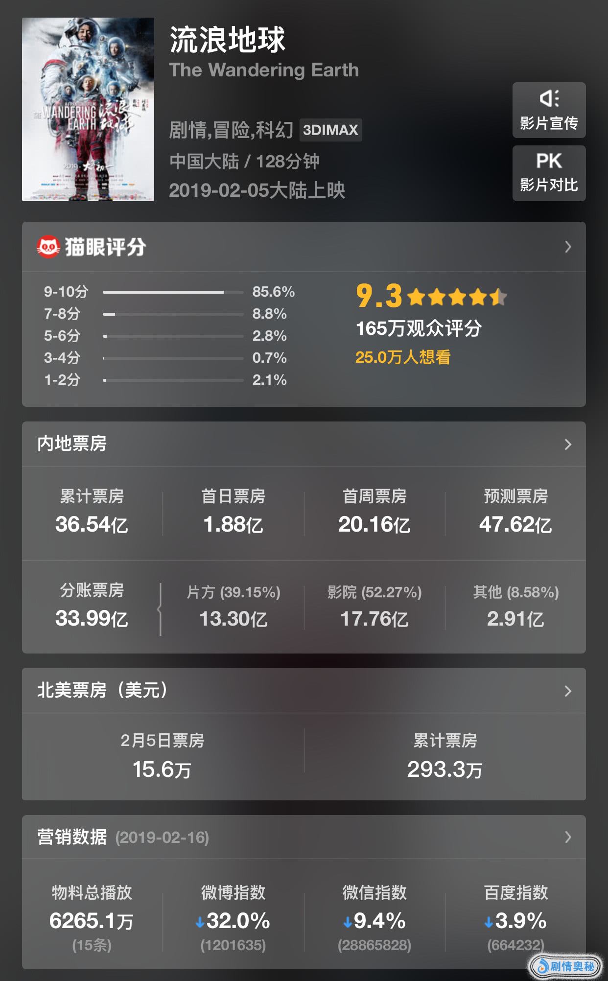 《流浪地球》于2019年2月5日大年初一上映,上映3天票房逆袭成为春节档单日票房冠军,上映第13天,票房达到36.55亿元,连续10天保持单日票房冠军,猫眼购票观众评分为9.3分。