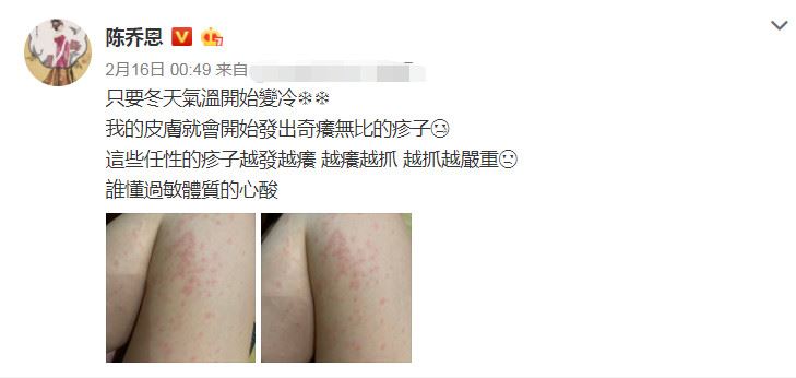 陈乔恩发文告诉大家,只要冬天气温开始变冷的时候,自己的皮肤就会开始发出奇痒无比的疹子,并且这些疹子越来越痒,越抓还会越严重,从陈乔恩的解释来看她应该是过敏性体质,所以身上才会长这些东西,从晒出的照片来看的确有些严重,红色的小疹子连成一大块看起来都很难受,痒又不能抓肯定是很痛苦的一件事情了。
