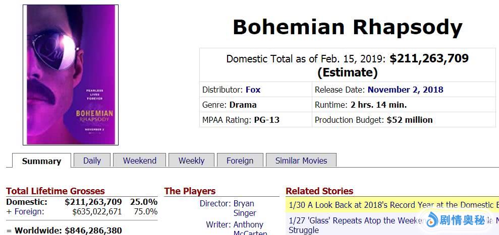 “皇后乐队”的主场是在欧美,按理在亚洲的票房不可能比欧洲高,可是影片在日本却产出了逆天的票房,一跃成为海外市场最卖座国家。那么《波西米亚狂想曲》在日本到底卖了多少票房呢?它的票房战绩有多“恐怖”呢?从去年11月9上映到现在还未下线,放映了近4个月了。
