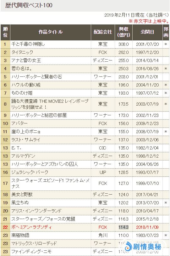《波西米亚狂想曲》日本2018年11月9日公映,首周无悬念夺冠,开画票房累计收了4.86亿日元。该片虽然在日本只拿到过2周冠军就被《神奇动物2》挑落马下,但是它的后劲逆天,截止上周(2月11日)累计票房狂轰了114.3亿日元(约7亿人民币)。一部音乐片辗压所有大片登顶年度票房冠军,它的历史排名高达22位,近10年了也就《美女与野兽》《星球大战7》能破百亿并且票房比它高。