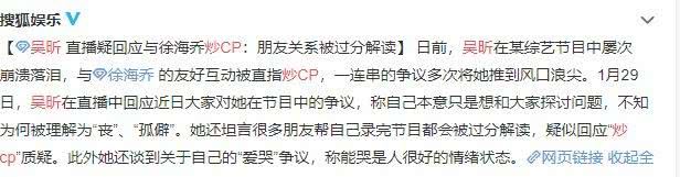 吴昕后来在1月29日的直播中回应过“炒cp”这件事,称朋友关系被过分解读。