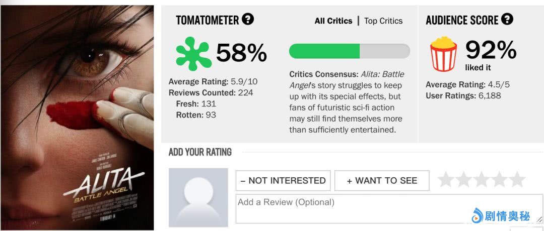 烂番茄反而有比较大的争议,新鲜度只有58%,5.9分(满分10分),但观众爆米花指数就高达92%,4.5分(满分5分);评分也是一样的趋势,这一点倒是和之前的《毒液》比较像。