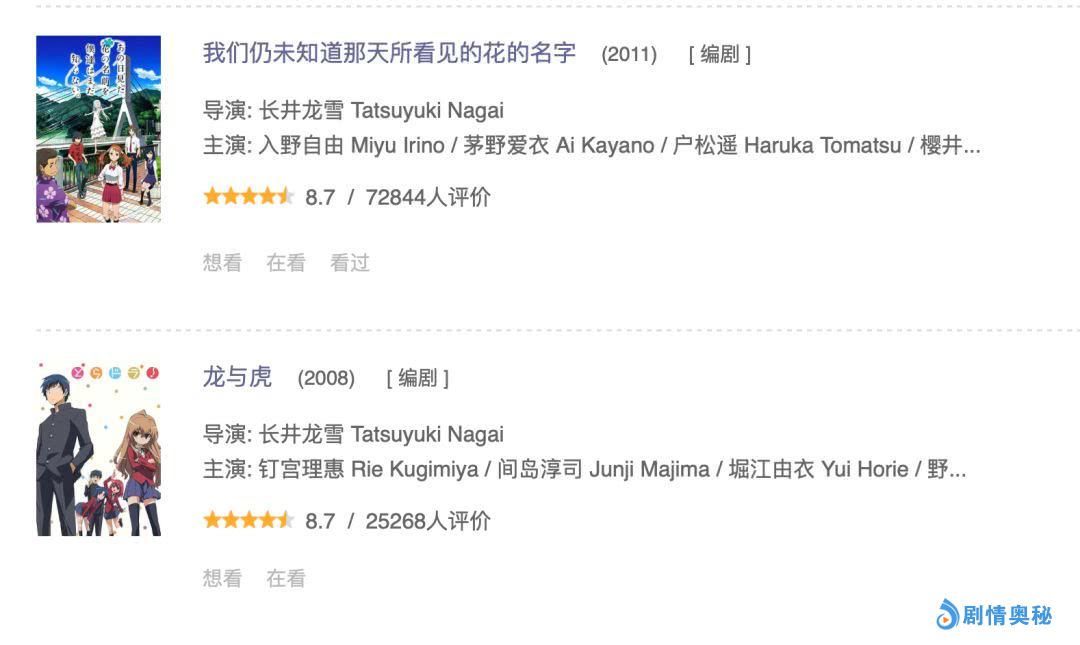 她此前已经是经验丰富的编剧了,代表作包括《龙与虎》《我们仍未知道那天所看见的花的名字》,都是评价超好的少女向动画。