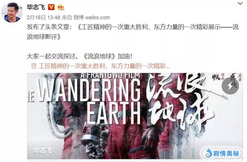 毕志飞于2月7日看完了《流浪地球》,于是开始创作,奋斗了将近十天,在16日,毕志飞在微博发布了一篇影评《工匠精神的一次重大胜利,东方力量的一次精彩展示——流浪地球影评》,字数长达1.4万字,旁征博引,就像是写论文一样写了一篇影评,充分体现了他对电影的热爱。