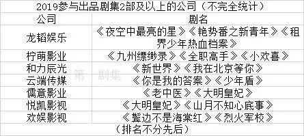 除了头部公司依然维持着竞争力,从目前五大卫视、四大平台公布的片单来看,2019年的影视剧市场参与出品2部或2部以上的公司超过7家。