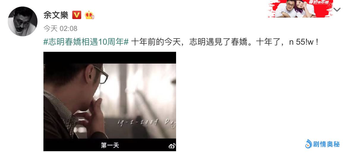 饰演张志明的余文乐今日深夜发文纪念张志明和余春娇相遇10周年。