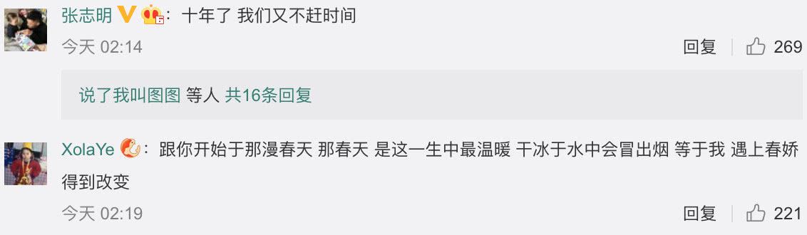 网友们也纷纷用跟电影有关的梗来表达怀念,“十年了,我们又不敢时间”,“跟你开始于那漫春天,是这一生中最温暖,干冰于水中会冒出烟,等于我,遇上春娇得到改变”。