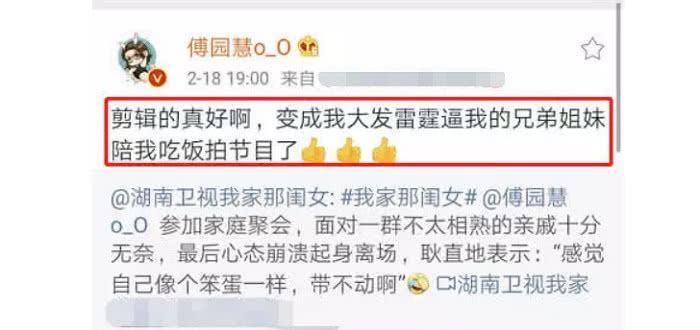 傅园慧转发《我家那闺女》官博的宣传微博并说道:“剪辑的真好啊,变成我大发雷霆逼我的兄弟姐妹陪我吃饭拍节目了”,不得不说傅园慧真的是个耿直女孩,光明正大就将节目组乱剪辑的事实说了出来,但没过多久这条霸气的回应就被删除了,估计也是节目组跟她道歉了吧,希望傅园慧今后能改改这个脾气,毕竟最后吃亏的还是自己呀。