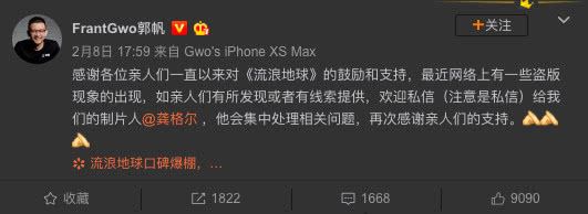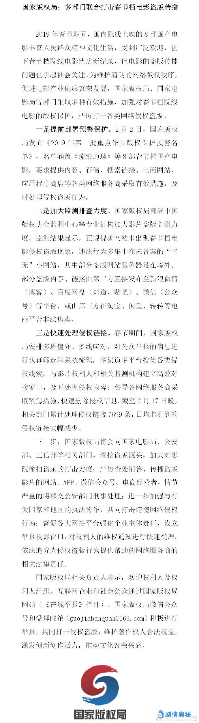 据国家版权局消息,为加强对春节档院线电影的版权保护,国家版权局、国家电影局等部门采取多重措施,严打各类网络侵权盗版。截至2月17日晚,相关部门累计处理侵权链接7699条。2019春节档电影在上映后出现高清资源,包括《流浪地球》在内的数部影片曾联合发布维权声明,敦促侵权方下线资源。