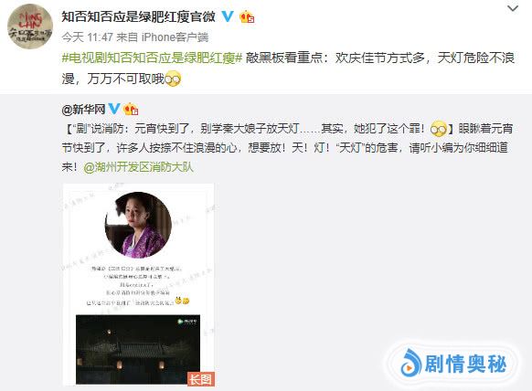 “敲黑板看重点:欢庆佳节方式多,天灯危险不浪漫,万万不可取哦。”因此当大家看到第二条微博的内容时,纷纷露出了满意的笑容。至于让粉丝们欣慰的内容,则是官微转评新华网的一则元宵温馨提示。当中还提到了一个因火下线的角色小秦氏。“剧说消防:元宵快到了,别学秦大娘子放天灯……其实,她犯了这个罪!”