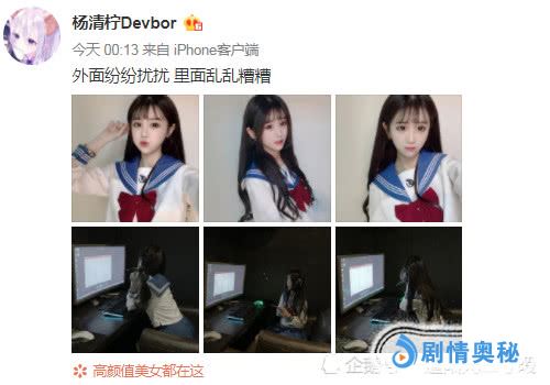 在这一条微博当中,杨清柠发了自己最新的美照,而且配了一段话“外面纷纷扰扰,里面乱糟糟”。其实单看这句话,或许只是指的杨清柠在网吧内外的状况,但是往更深层次里想,这句话也是对最近王乐乐的新恋情所作出的一种回应。因为我们都知道王乐乐和杨清柠之前两个人是一对,但是最近的时候王乐乐也是刚刚的公布了自己的新女友,在他公开自己的新女友之后,却没有得到大家的祝福。