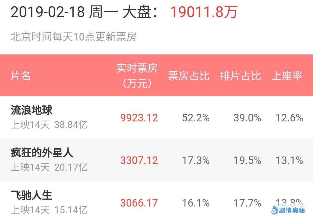 二、《流浪地球》上映已超过两周,热度下降在所难免。从近期的票房走势看,后劲乏力是事实,昨天(1月18日)的9923万更是首次跌破1亿!