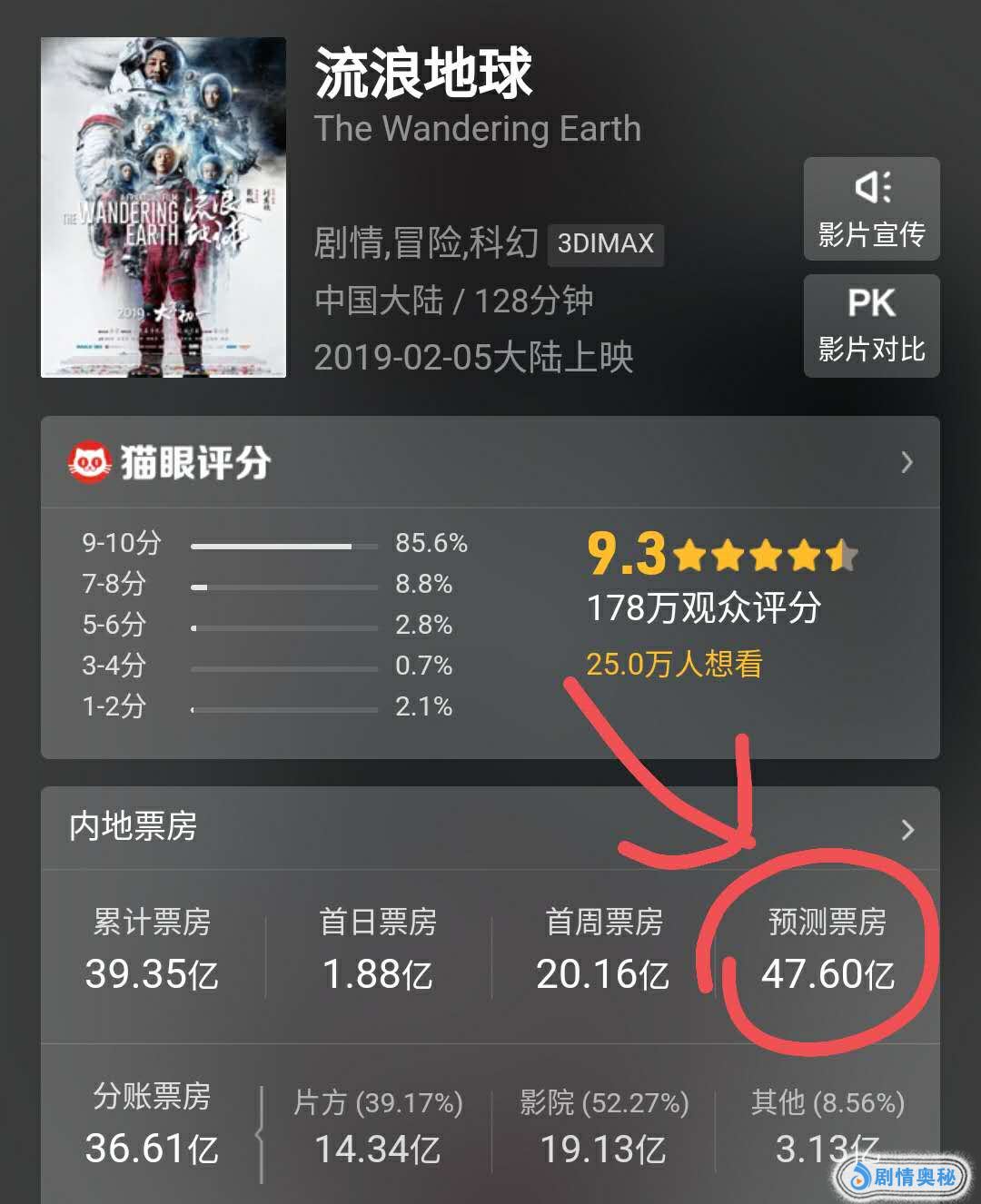 但奇怪的是,猫眼专业版对《流浪地球》的预测票房却一再下调,从52亿降到50亿,目前更是掉到了47.6亿。