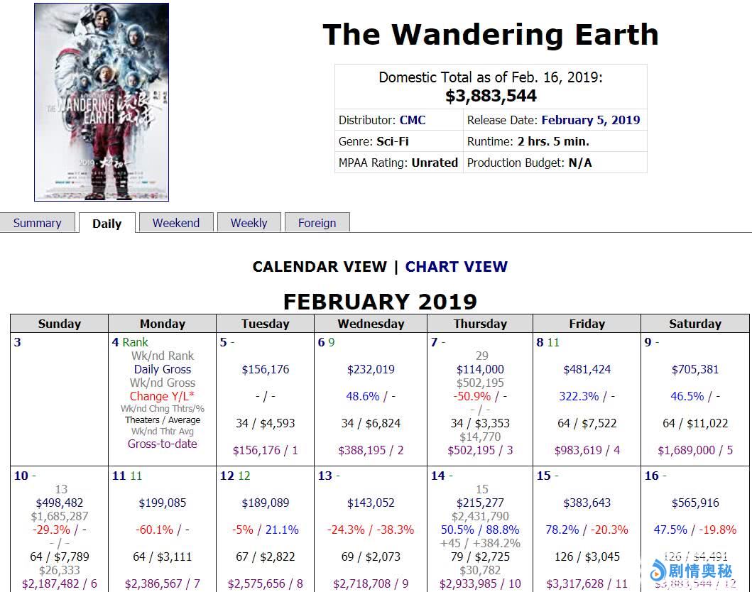 《流浪地球》在北美首周狂收了218万美元,凭借爆棚的口碑和火爆的上座率,它很快就赢得当地院线的支持,上周末规模扩大了近一倍高达126家戏院公映。从它的每日数据可以看出后劲十足,它不仅跌幅小时不时票房还暴涨,截止2月16日周六累计388万美元,算上周日票房已经冲破400万美元以上了。