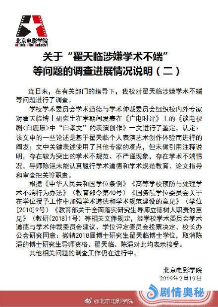 2月19日下午,北电公布翟天临学术不端事件的处理结果。认定翟天临博士研究生期间发表的论文存在学术不端情况,决定撤销翟天临博士学位,并且取消陈浥博士研究生导师资格。二人均表示同意,其他问题目前仍在调查中。