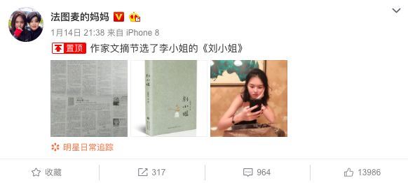 哈文把这条微博设置为置顶,他们的女儿令人骄傲。