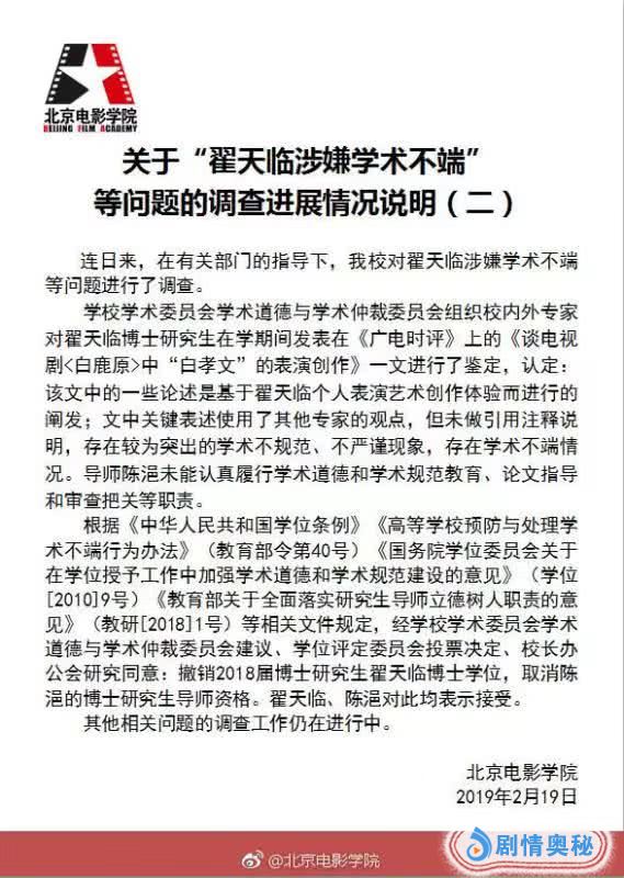 2月19日,北京电影学院发布关于“翟天临涉嫌学术不端”等问题的调查进展情况说明,其中表示,学校学术委员会学术道德与学术仲裁委员会组织校内外专家对翟天临博士研究生在学期间发表在《广电时评》上的《谈电视剧中“白孝文”的表演创作》一文进行了鉴定,认定:该文中的一些论述是基于翟天临个人表演艺术创作体验而进行的阐发;文中关键表述使用了其他专家的观点,但未做引用注释说明,存在较为突出的学术不规范、不严谨现象,存在学术不端情况。