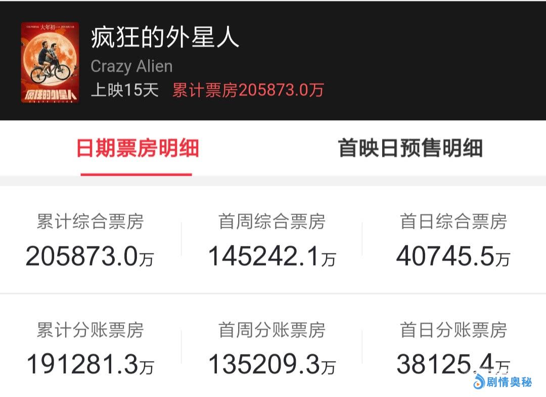 虽然《疯狂的外星人》口碑不佳,豆瓣评分仅6.4,创“疯狂”系列评分新低,但是凭借黄渤和沈腾的强大号召力,电影还是取得了相当不错的票房,首日票房大破4亿,上映15天票房高达20.5亿,已远超投资成本!