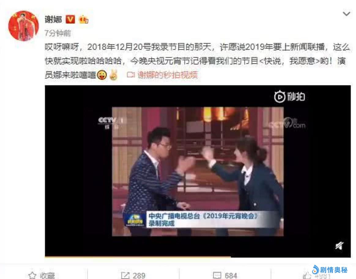 近日谢娜在社交平台上发文称“哎呀嘛呀,2018年12月20号我录节目的那天,许愿说2019年要上新闻联播,这么快就实现啦哈哈哈哈,今晚央视元宵节记得我们的节目《快说,我愿意》哟!演员娜来啦嘻嘻”。