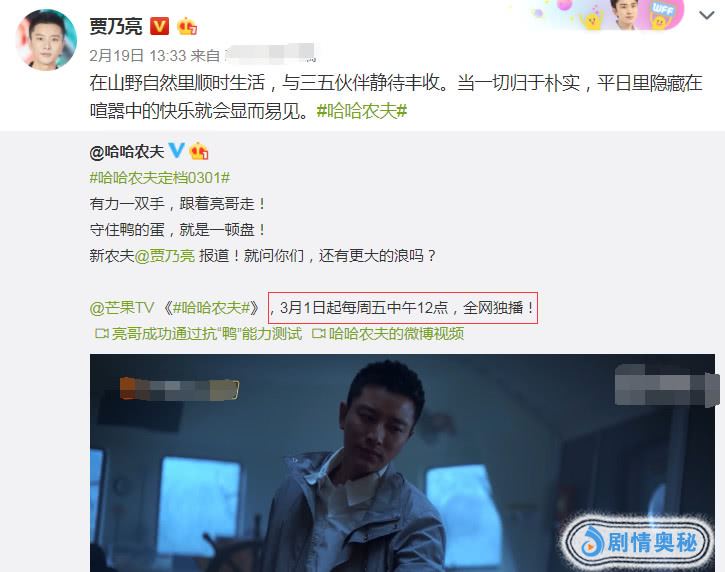 这档节目的名字叫做《哈哈农夫》,光看这个名字大家应该都知道是跟乡村田野有关的,但与《向往的生活》还是有很大的区别,这档节目嘉宾们主要就是要像农夫一样干活,而不是享受,这也是芒果台第一档这一类的节目吧?贾乃亮参与录制的《哈哈农夫》已经官宣会在3月1日起每周五中午10点播出。