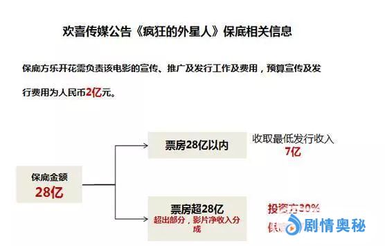 按照欢喜传媒与乐开花签订的这份“天价保底”协议,保底方乐开花影业需负责电影的宣传、推广及发行工作及费用,预算宣传及发行费用2亿元,全部由保底方承担。而不论该电影的总票房收入是超出或低于28亿元,投资方欢喜传媒都不会承担宣传及发行费用,还将有权收取影片保证最低发行收入7亿元。