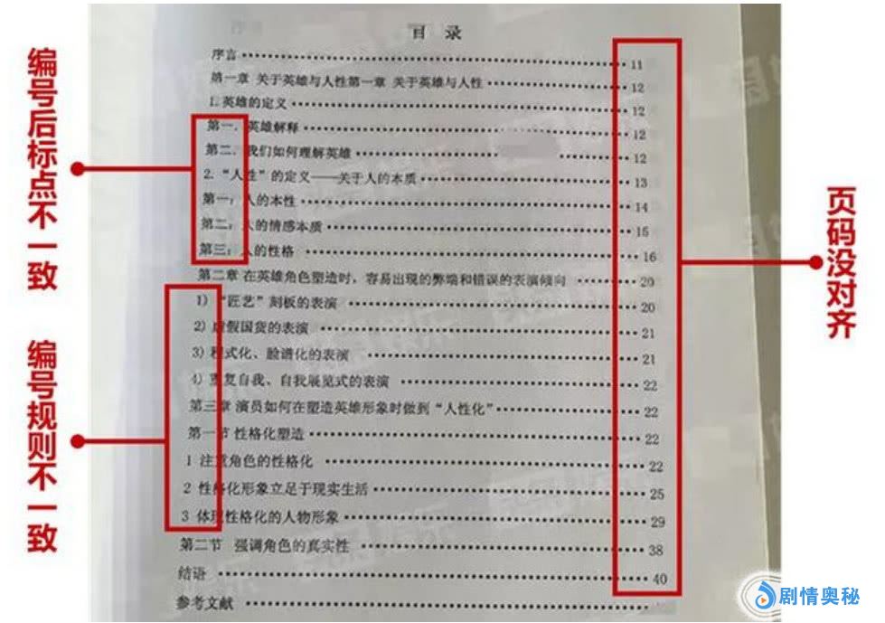 首先是页码没有对齐,其次是编号后面的标点都不一致,有的后面是冒号,有的后面是分号。而且编号的规则都不一致啊。起码前后应该统一的啊。因为稍微会点儿 Word 文档排版的都明白的啊。关键这样的目录竟然没被退回来重新做。还让我们看见了。应该更逃不过导师法眼啊!