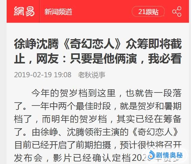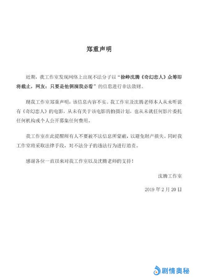 2月20日下午,沈腾工作室针对近期网上流传的“徐峥沈腾《奇幻恋人》众筹即将截止,网友:只要是他俩演我必看”的消息,发布郑重声明,否认出演电影《奇幻恋人》,从未就任何影片委托任何机构或个人公开募集任何费用,是不法分子以这一信息进行非法敛财。