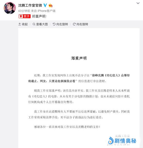 但还没等大家开始期待,沈腾工作室就火速发出了辟谣声明,称沈腾本人没有这部电影的拍摄计划,也没有授权过众筹,工作室将采取法律手段,对违法行为进行追责。