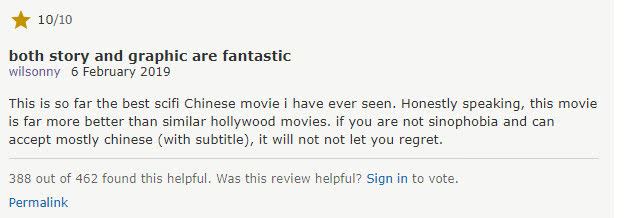 跟在下面的是一个打10分的网友,他的评论标题写着“故事和画面都很棒”,他在评论中写道“这是迄今为止我看到的最好的中国科幻电影,这部电影比好莱坞同类电影要好得多。如果可以接受中文字幕,那就不会让你后悔。”