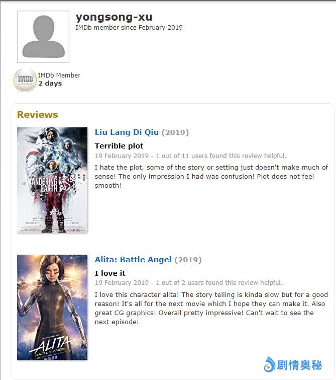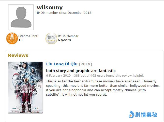 点开他的资料,发现注册时间在2012年,但也仅给《流浪地球》一部电影打过分。
