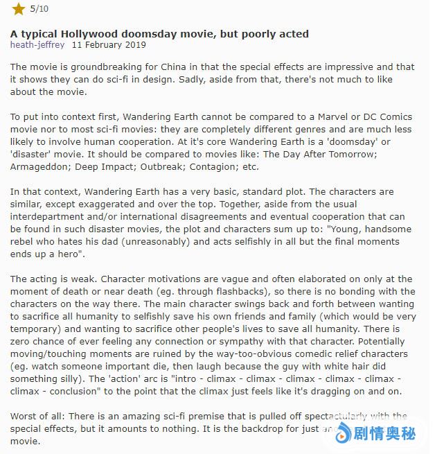 在众多9分、和10分的评分中,我们找到了一条相对真实的评论,这位影迷给超过500部电影打过分,他给电影打了6分,评论的标题是“一部典型的好莱坞世界末日电影,但表现不是很出色”他的评论非常中肯,他首先很清楚这部电影是中国科幻片的奠基之作,证明了中国电影终于成功创作出了科幻类型片。但他觉得不能把《流浪地球》和漫威、DC的电影相比,因为这更像是一部“末日”和“灾难”片,同时他很难认可电影里刘启恨自己父亲这样的设定,同时批评电影演员们的演技较差。