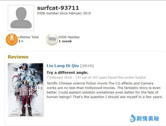 接着看到一个给《流浪地球》打5分的网友,注册IMDb超过10年,给多部电影打过分,他说“这部电影就在我附近放映,但是我发现这部电影所有用户的评论都像是让人厌恶的宣传。”显然他和我们一样,发现《流浪地球》在IMDb的评分有点不正常了。