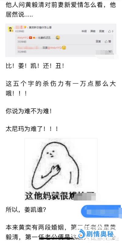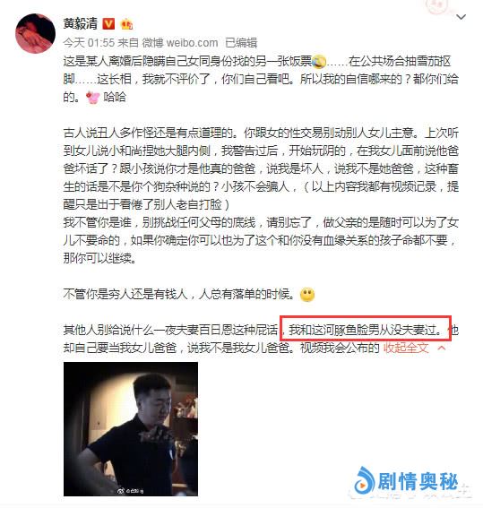 今天凌晨,黄毅清微博骂街,这一次的目标转移到了黄奕的现男友身上!黄毅清全程的内容就是诋毁,还直接叫这个男人“河豚鱼脸男人”。称自己的女儿还被他骚扰,可能是发此微博的时候太激动,所以字都没打明白“我和这河豚鱼脸男从没夫妻过”。
