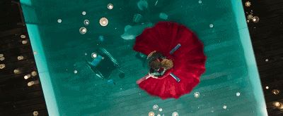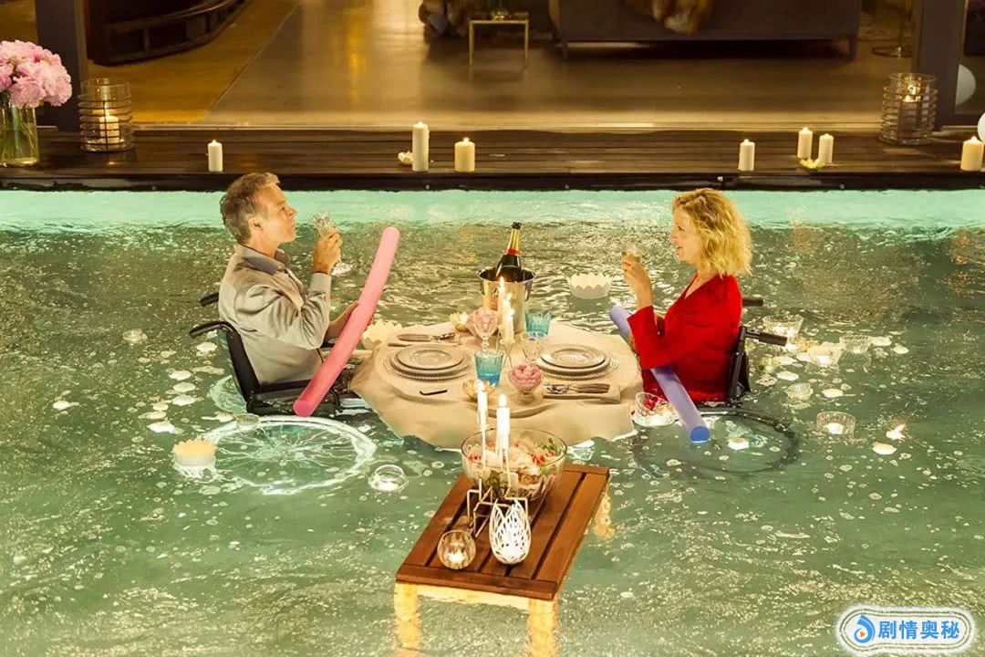 他为她炮制最浪漫的烛光晚餐,上演了一场“泳池中的泰坦尼克号”:地面下沉,水流涌入,女主的红裙如同花瓣一样展开…