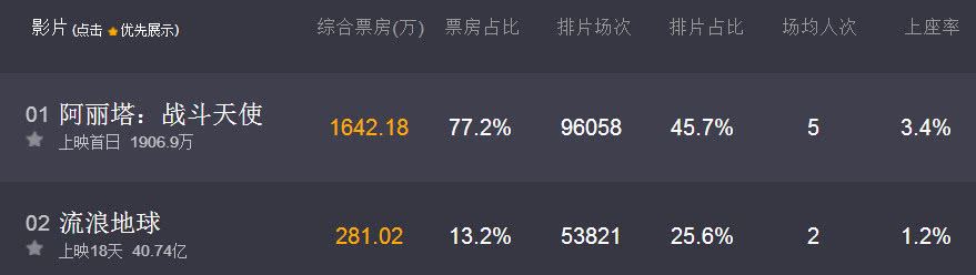 《阿丽塔》这部科幻大片的上映,估计会分走《流浪地球》一半以上的排片,到时候电影的单日票房估计还会有所下降。这么算起来《流浪地球》最终的票房想要超越《战狼2》基本是没有希望了,就看是否能够顶住压力冲上50亿票房了。