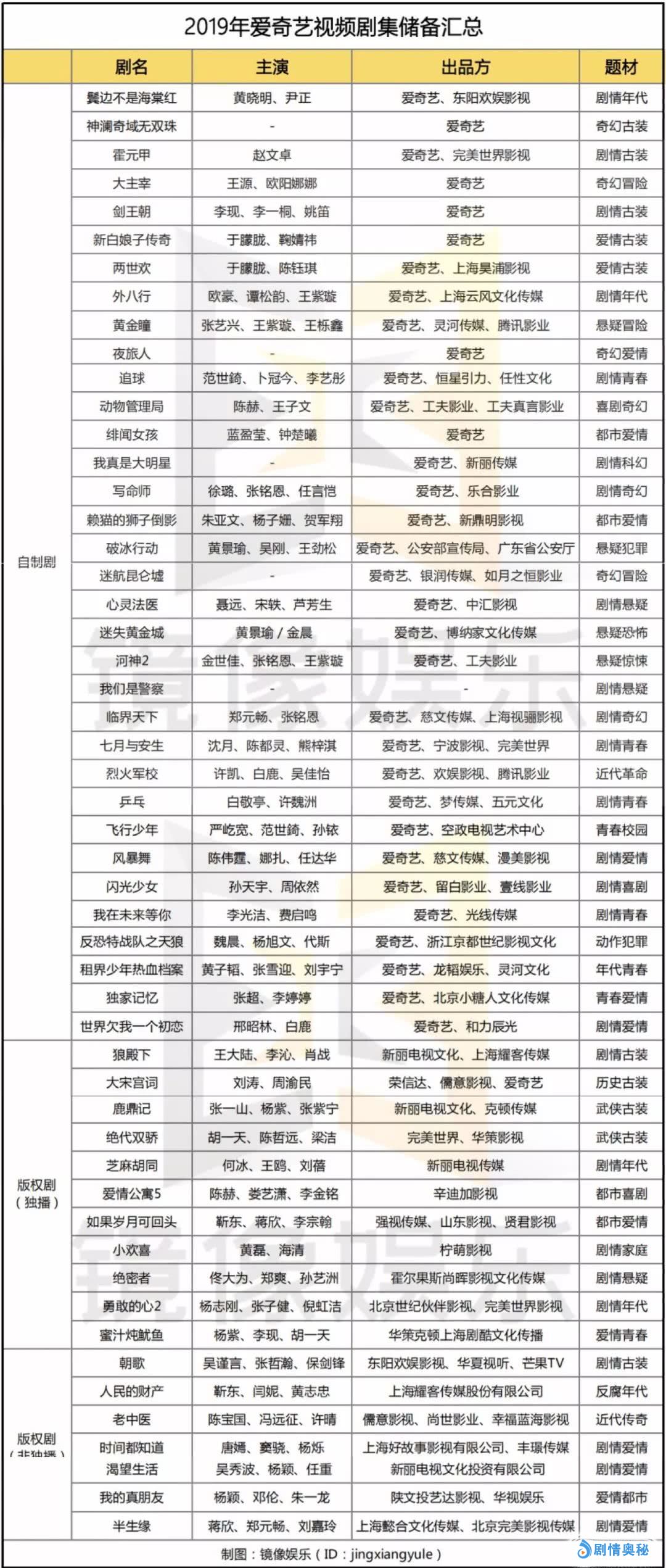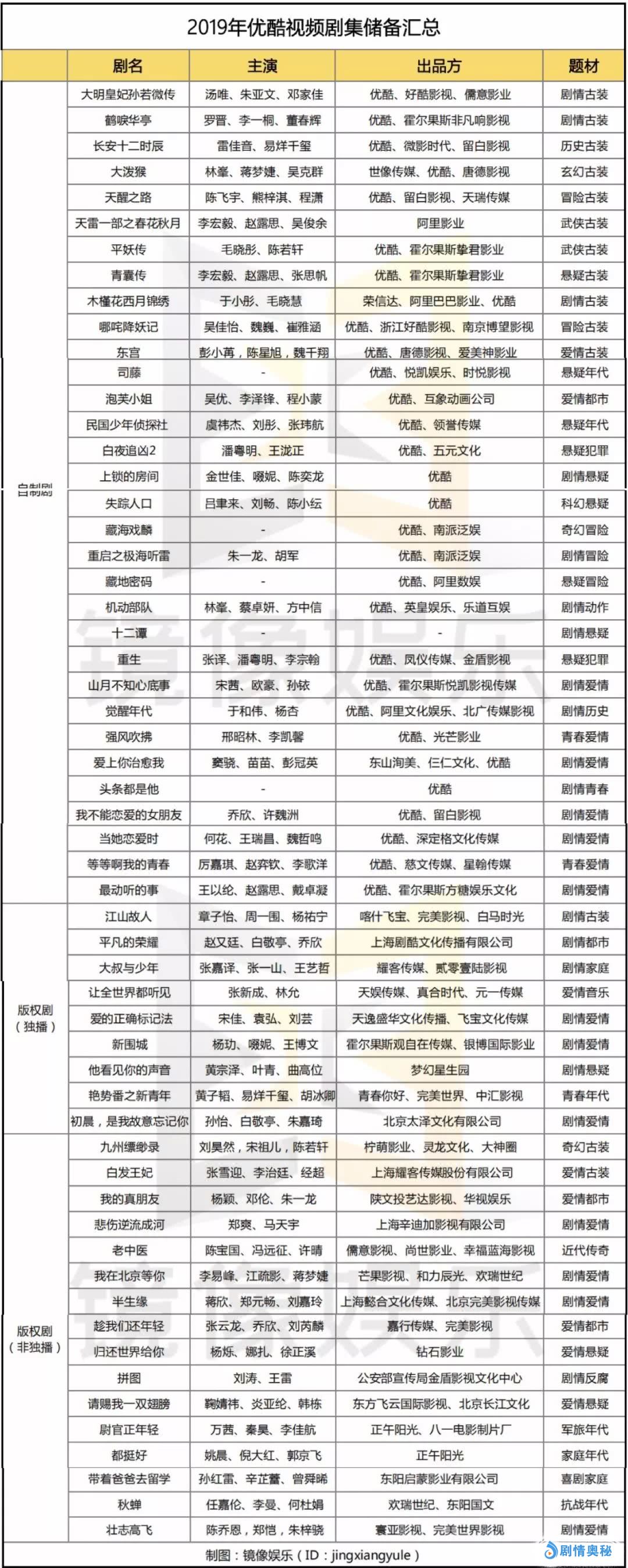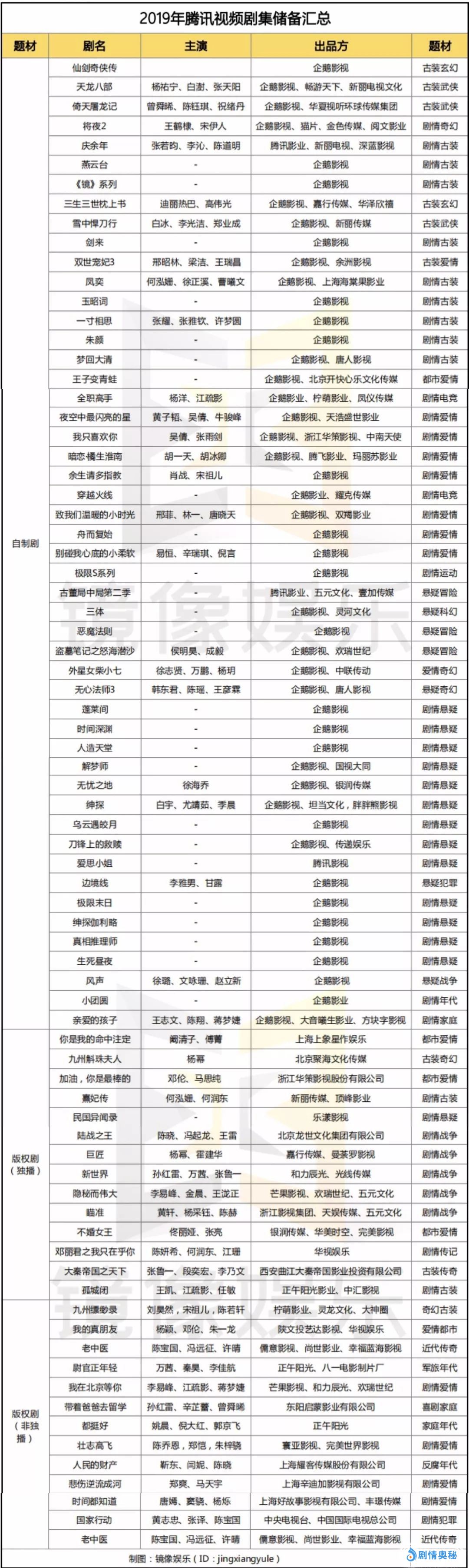 本文整理汇总了2019年“优爱腾”的待播剧集,在2018年视频网站自制剧首次超越版权剧之后,2019年视频网站的自制剧占比已经达到了65%。除了古装和青春剧之外,悬疑剧依旧是视频网站发力重点,2019年,腾讯视频的悬疑剧数量达到了21部,在自制剧中占比42%。