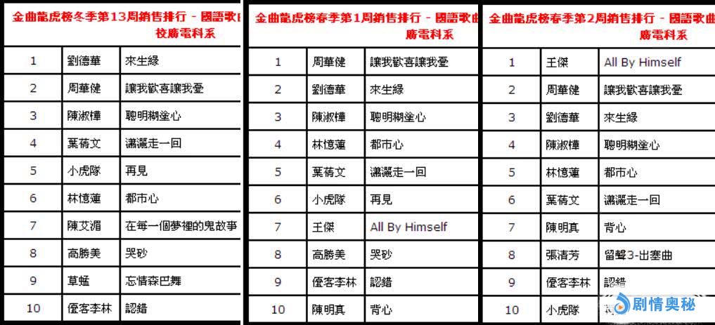 根据当年台湾金曲龙虎榜统计的每周销量排行榜,冬季第10-13周,刘德华《来生缘》连续4周蝉联了冠军,第五周时候被华健逆袭。周华健《让我欢喜让我忧》前面连续4周屈亚军,终于在春季第1周(第5周)逆袭登顶夺冠了。王杰这时候也来凑热闹,《All By Himself》共拿到2周冠军,此时的王杰巅峰不再了,该专辑销量只卖了40万张。