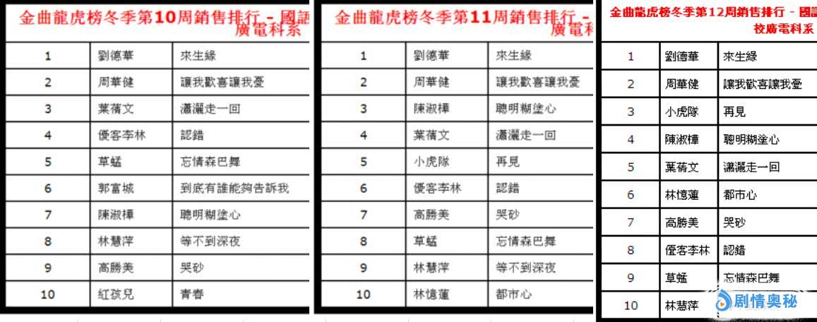 销量大战继续进行春季8-10周,周华健《让我欢喜让我忧》排名3、5、9位,刘德华《来生缘》排名9、后面两周出前十。第11周《让我欢喜让我忧》排名第十,这张大碟后劲比华仔强很多,这其实也是实力跟偶像派的区别。刘德华共上榜10周前十,具体排名分别为:1、1、1、1、2、3、2、4、7、9。周华健共上榜13周具体排名:2、2、2、2、1、2、1、2、3、3、5、9、10。