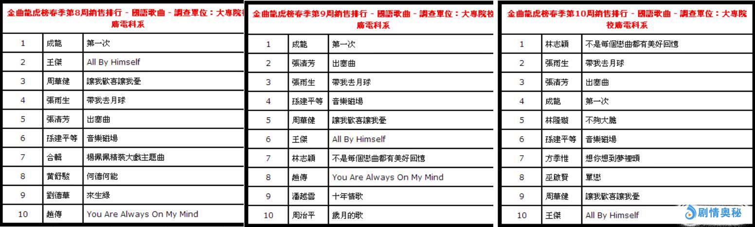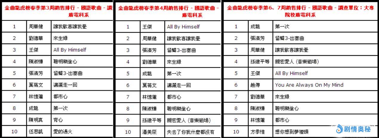 《让我欢喜让我忧》春季第3周时候又逆袭夺冠,后两周排名2、3位,《来生缘》排名2、4、7位,从这里可以看出华仔大碟后劲不足。成龙当年真不愧为是超级巨星,他发行的《第一次》连续3周销量榜冠军。这段时间的竞争真的太激烈,张清芳,林忆莲,陈淑桦,赵传都出了大碟。