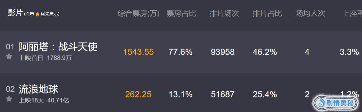 截至2月20号从预售票房来看《阿丽塔:战斗天使》极有可能掀翻《流浪地球》