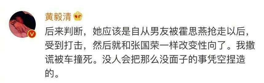 最近黄毅清更是“疯”的有点厉害,连续在微博发一些神神道道的言论,鄙视同性恋的同时还牵涉上了黄奕和霍思燕,称黄奕被霍思燕抢了男友之后就性取向不正常,经常和闺蜜睡一起反锁一夜的房门,和自己结婚也是“图谋”良好基因,只是为了生孩子,黄毅清这个话也是自恋到了极点。