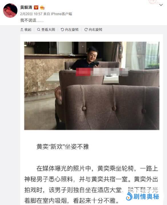 近日有篇文章称黄奕“新欢”坐姿不雅,文章中说该男子对黄奕悉心照料,共宿一室,黄奕外出拍戏时,男子独自坐在酒店大堂,脱了鞋子在室内抽烟,十分不雅。文章还引用了黄毅清回复网友的话,评论该男子:比姜凯还丑!