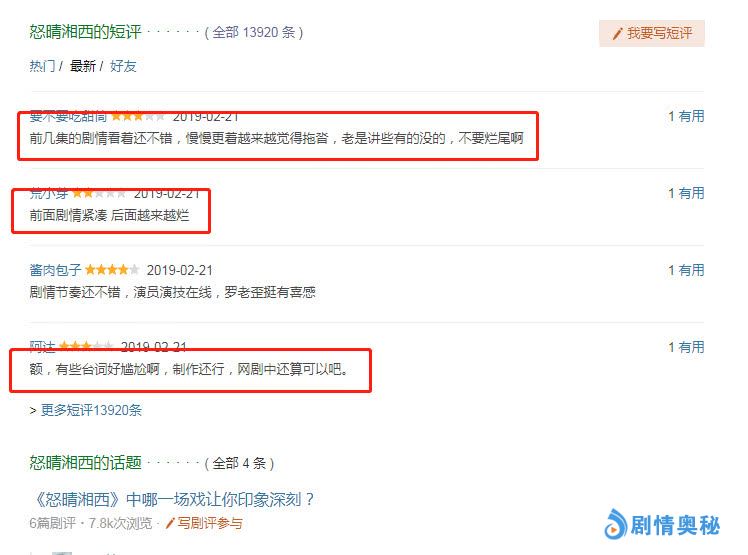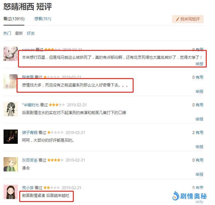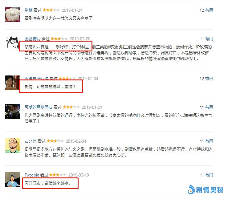 介于该剧高开低走后,手贱又去翻看了一下导演的过往作品,感觉拍成这个样子也是情理之中。四个编剧除去挂名的霸唱,其他三个加一起也没写出过什么像样的东西!整个片子给人感觉就是金玉其外,败絮其中——所有表面功夫都做得不错,但核心的剧情崩了。促使了众多网友和观众纷纷吐槽,批斗该剧,甚至还有网友喊出来弃剧的念头。
