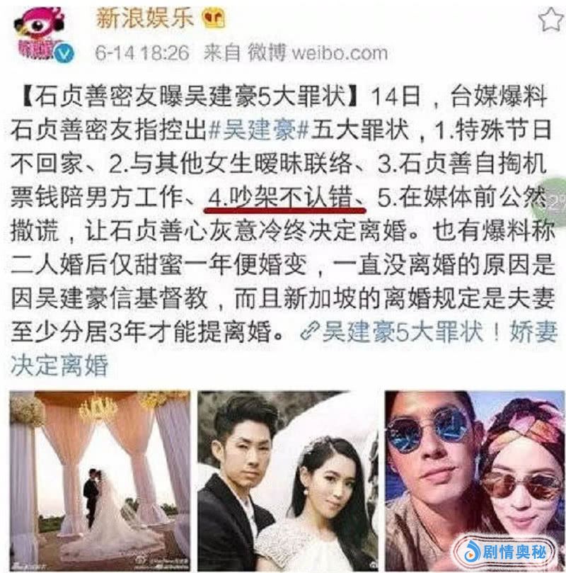 石贞善在她们婚姻存续期间,就多次发文抱怨说,你电视上所看到的吴建豪都是假的,还表示自己多年以来一直受各种谎言欺骗以及情感上的折磨。据说,石真善的好友曾经爆出了吴建豪的5个大罪状:其一,特殊的节日从不回家。其二,和女生搞暧昧。其三,石真善自己掏腰包买机票陪吴建豪工作。其四,吵架后不认错。其五,在媒体前说谎话。