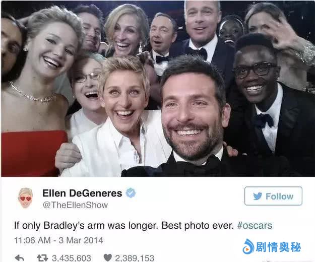 据悉,合影在30分钟内就被转发77.9295万次,那年颁奖礼观看人数达到了4374万,成为2000年以来的峰值。