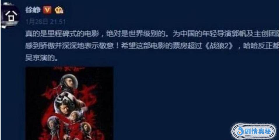 而且对于这样的电影,娱乐圈公然表示支持的竟然寥寥无几。先是徐峥,发博力挺该片,还希望票房可以大卖。徐峥是第一个,之后李晨、彭于晏、陈坤也表示了支持。偌大的娱乐圈就这几个人支持吴京,支持新人导演郭帆么?和曾经的《摆渡人》形成了鲜明的对比。