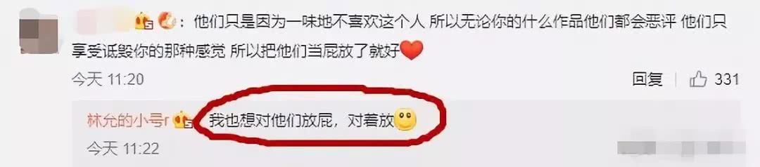 有粉丝评论“就当他们放了个屁”,林允也毫不顾忌地回复“我也想对他们放屁,对着放。”